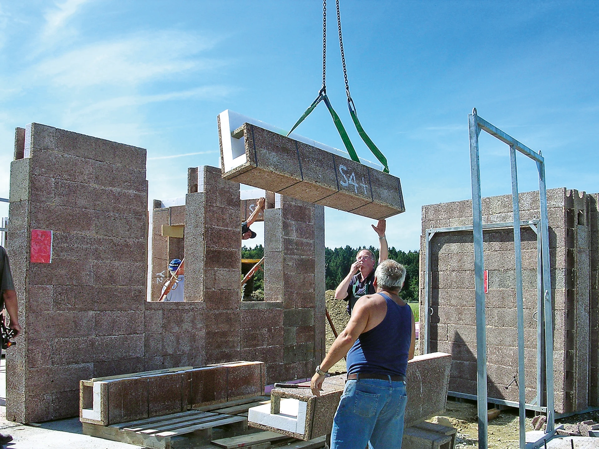 Diese werden mit Hilfe des Baustellenkrans direkt vom LKW auf die Decke gehoben.
